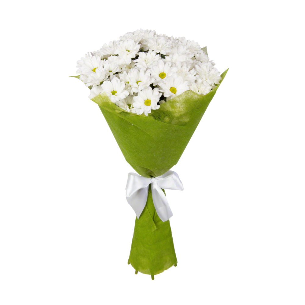 Роскошный букет из свежих хризантем в стильной фетровой упаковке — воплощение утонченного вкуса.